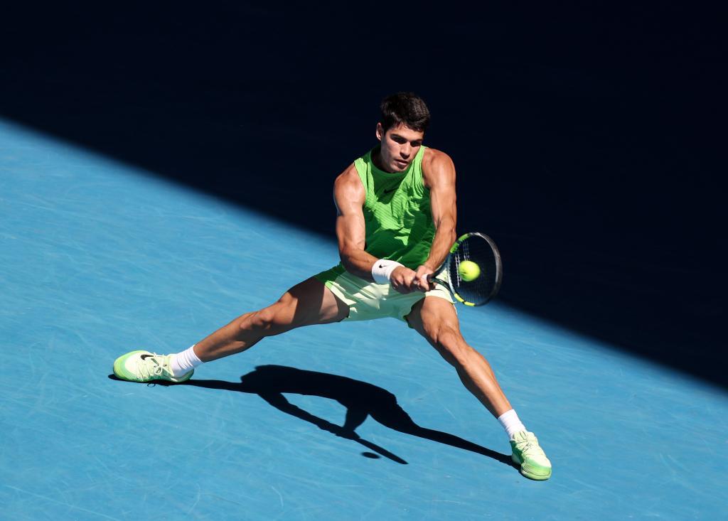 1月30日,阿尔卡拉斯在比赛中回球。新华社记者 马平 摄