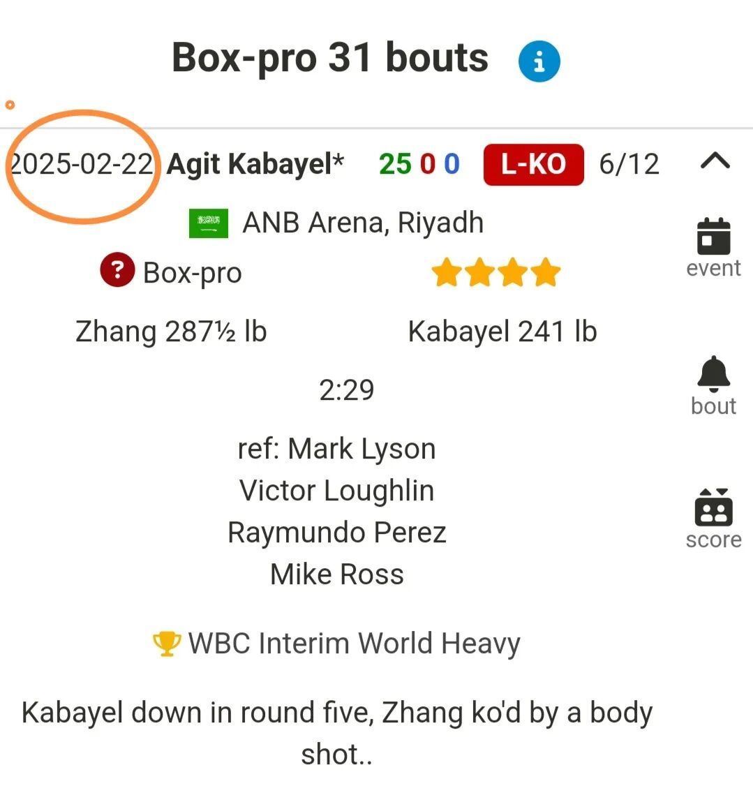 按照BoxRec的算法,任何拳手如若跨越365天没打比赛,他在该系统的排行将被清零。张志磊上一场比赛还要追猜测2025年2月22日,其时他被卡巴耶尔6回合KO,而后张志磊阅历了伤病、收复以及屡次考虑未果,永恒未能得到想要的比赛,基于死心到这篇著作发稿时距离2026年2月23日,也等于大岁首七只剩12天,张志磊不太可能在这样短技巧内临时接到见告插足比赛,因此张志磊在BoxRec的全国排行细则被取消。