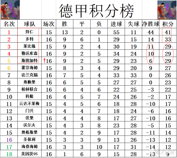 积分榜方面,拜仁13胜2平不时保捏不败,少赛1场发轫多特8分高居榜首。勒沃库森惨败后,净胜球少了莱比锡1个“自动”跌出前3,莱比锡躺进前3,斯图加特大捷后追了上来,净胜球颓势排在第5。
