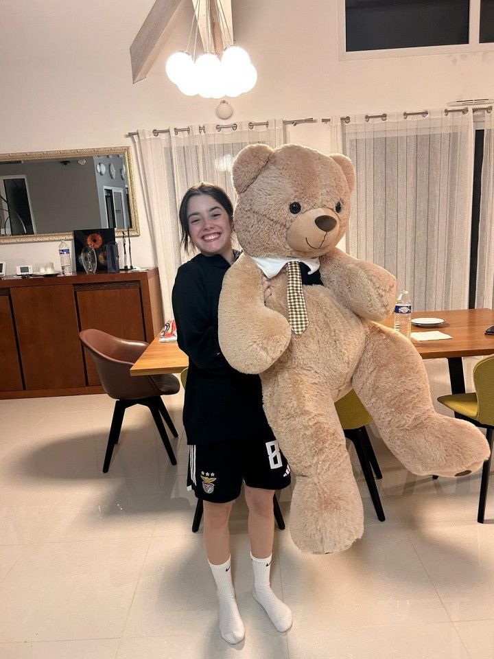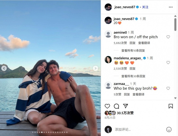 巴黎中场若奥-内维斯在社媒晒照,为女友马达莱娜庆祝她的20岁寿辰,女友也在批驳区与其互动。