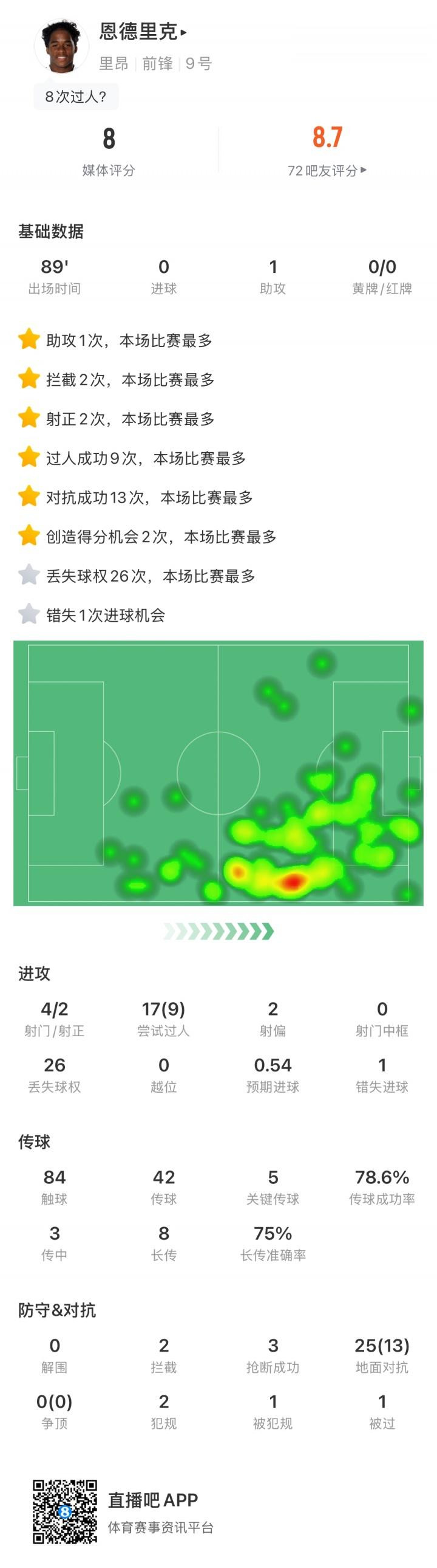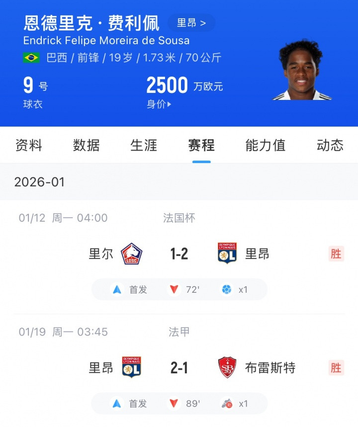 在里昂2-1布雷斯特的比赛中,恩德里克9次胜利过东谈主冠绝全场,况兼还孝顺1次助攻,获评8分队内最好。